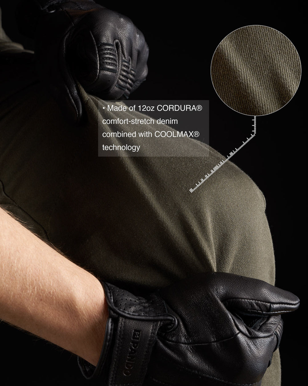 - 12oz CORDURA® super-stretch denim combined with COOLMAX® technology